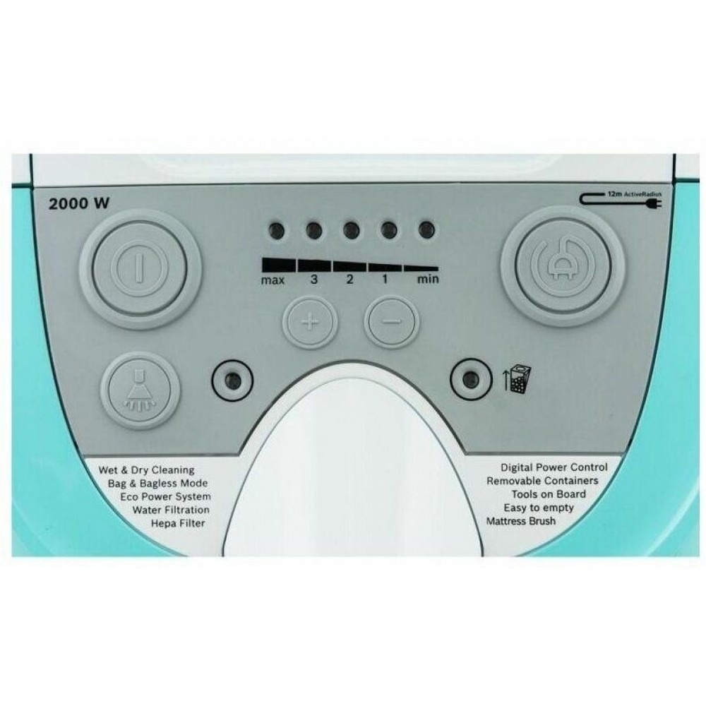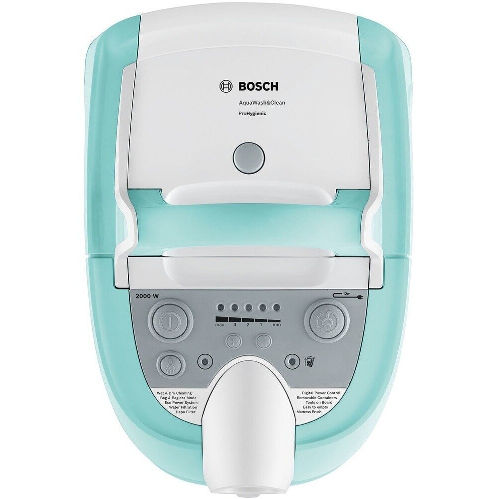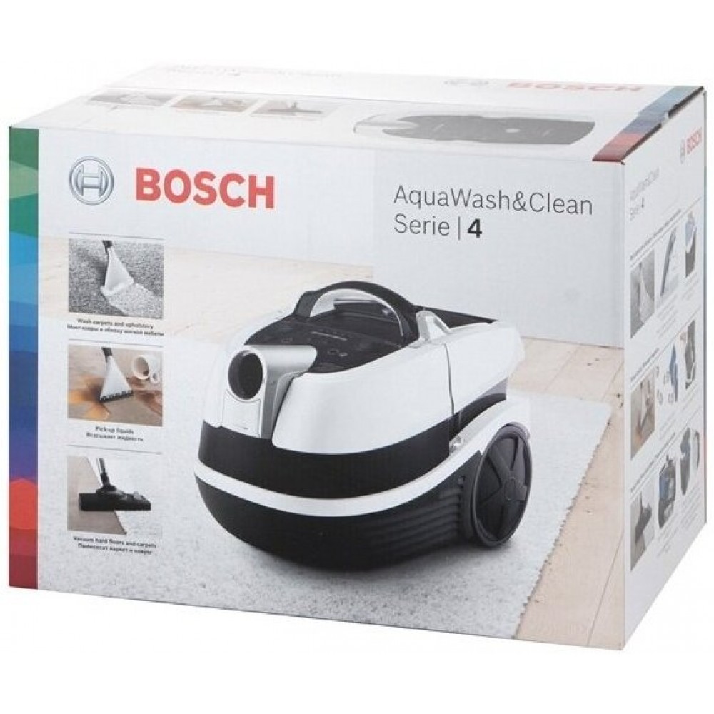 Пылесос Bosch BWD420HYG в бело-голубом корпусе одинаково эффективно справляется и с влажной, и с сухой уборкой. Он оснащен аквафильтром для сбора пыли и фильтром тонкой очистки. На корпусе модели расположен регулятор мощности, позволяющий регулировать интенсивность всасывания сора и пыли. Длинный сетевой шнур и телескопическая трубка обеспечивают пылесосу Bosch BWD420HYG радиус действия до 12 м. Кабель модели сматывается автоматически. В комплект поставки пылесоса входит набор насадок, что позволяет качественно убирать не только на полу или ковре, но и в углах, под шкафами и диванами, и в прочих труднодоступных местах. Для удобства использования модель оснащена большими колесами для перемещения по полу и ручкой для переноски.