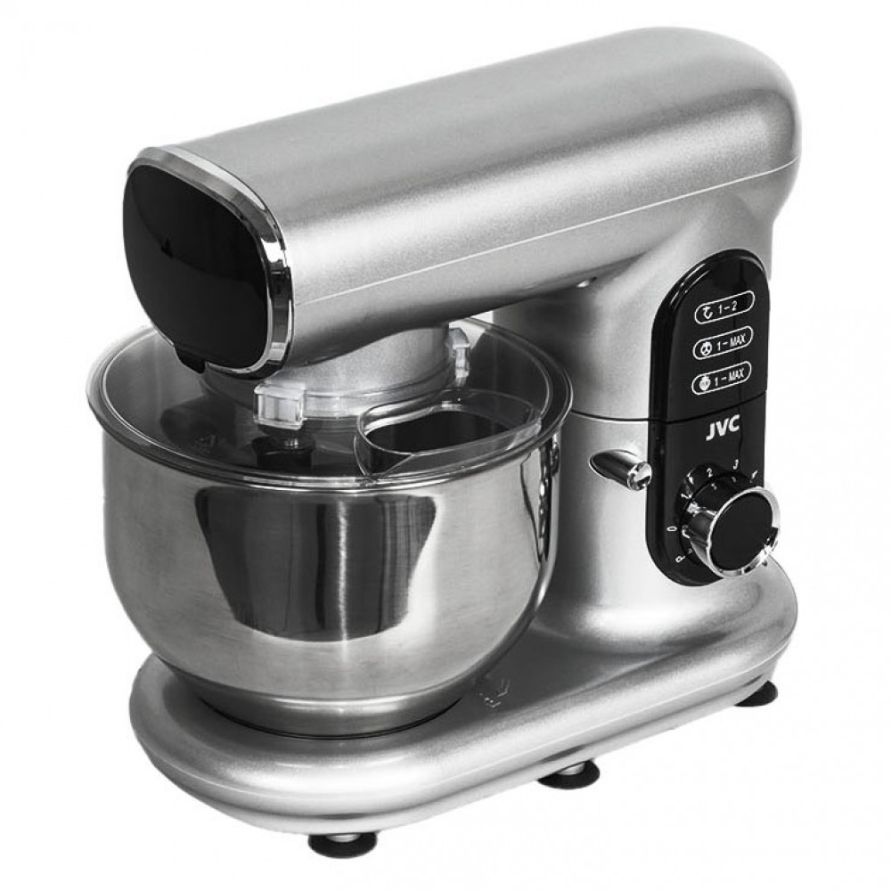 Миксер JVC JK-MX515 планетарного типа оборудован большой стальной чашей объемом 5 л. Все погружные элементы выполнены из металла. Основная часть корпуса сделана из прочного пластика, снизу установлены резиновые ножки-присоски, препятствующие скольжению и снижающие вибрацию во время работы. Доступно шесть скоростей вращения насадок, регулировка которых осуществляется при помощи поворотного переключателя. Максимальное время непрерывной работы составляет 5 мин. Устройство может работать в импульсном режиме. Двигатель оснащен защитой от перегрева. В комплекте идет прозрачная крышка с отсеком для добавления продуктов в процессе взбивания. Показатель потребляемой энергии миксера не превышает 1000 Вт. В набор входят три насадки.
