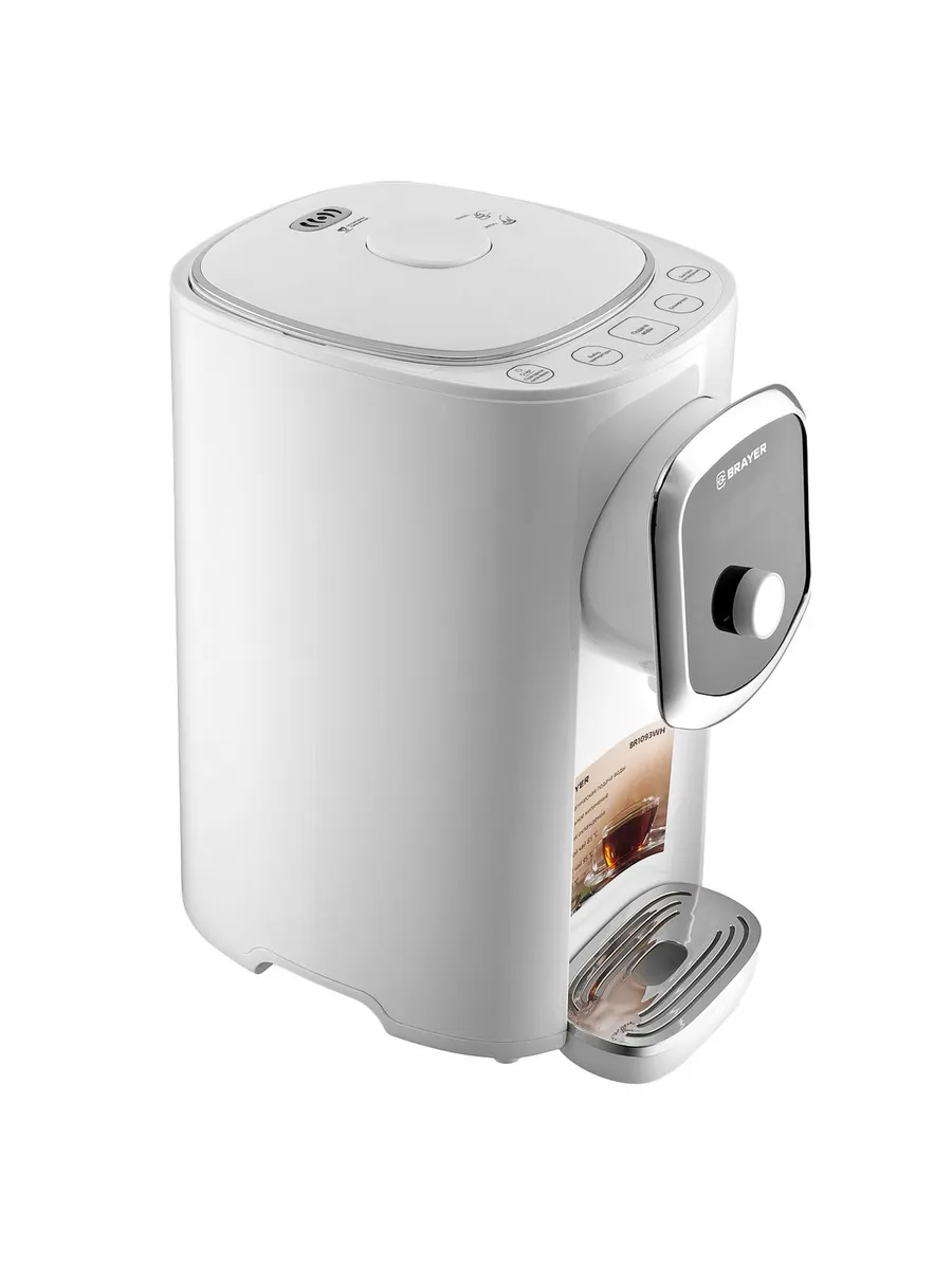 Термопот Brayer 1093BR-WH объемом 5 л будет оптимальным решением для большой семьи или компании гостей. Благодаря модели вы не только вскипятите воду за считанные минуты, но и поддержите ее в горячем состоянии в течение длительного времени. Резервуар изготовлен из прочного материала и не впитывает в себя посторонние запахи и токсичные вещества. Благодаря этому исключается присутствие привкуса в напитках. Устройство поддерживает температуру до 98°C. Для удобства есть блокировка подачи воды. Управление осуществляется с помощью механического поворотного регулятора и кнопок. Контролировать процесс рабочего цикла поможет небольшой дисплей. Если внутри емкости недостаточное количество воды, устройство отключается автоматически.