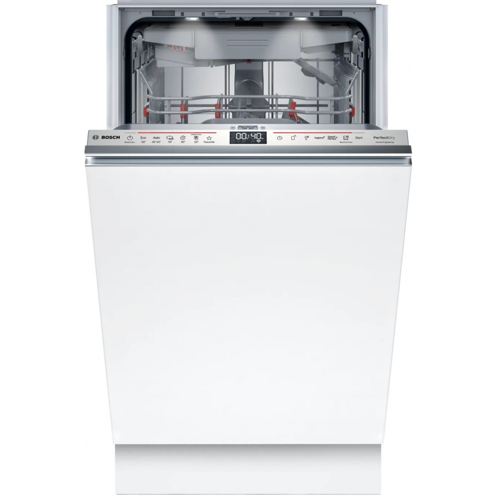 Встраиваемая посудомоечная машина Bosch SPV8ZMX06Q обладает сдержанными линиями и панелью из нержавеющей стали, которая гармонично встраивается в мебельный гарнитур и придаёт кухонному пространству аккуратный, современный вид. Узкая конструкция рассчитана на ограниченное пространство, при этом сохраняет функциональную вместимость на десять стандартных комплектов. Технологическая составляющая сочетает сразу несколько инноваций: инверторный мотор EcoSilence Drive минимизирует шум до 42 дБ и повышает ресурс агрегата, система ActiveWater оптимизирует расход — за цикл требуется всего 8.9 литра, а пятиуровневое распределение струй обеспечивает равномерное омывание посуды на всех полках. Сушка реализована через цеолит + теплообменник, что повышает эффективность высушивания и снижает риск образования пятен на стекле; технология защиты стекла дополнительно заботится о деликатных бокалах и тонкой посуде.