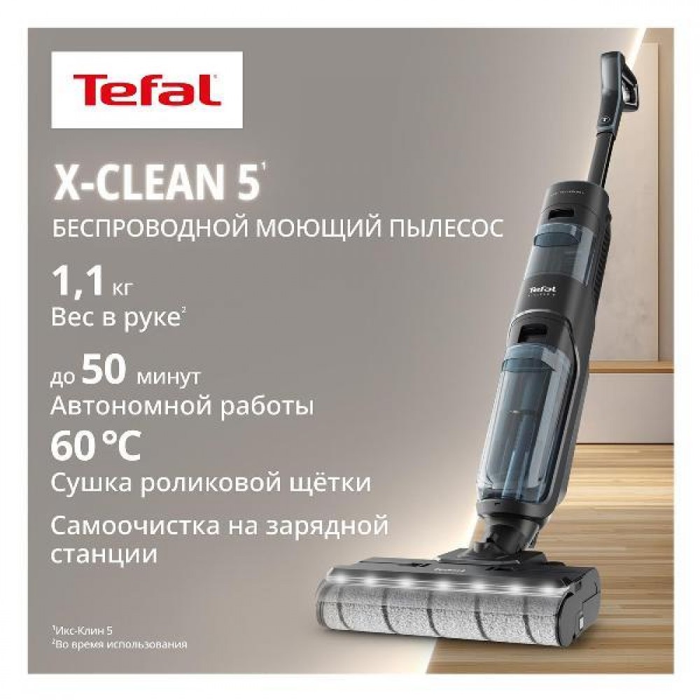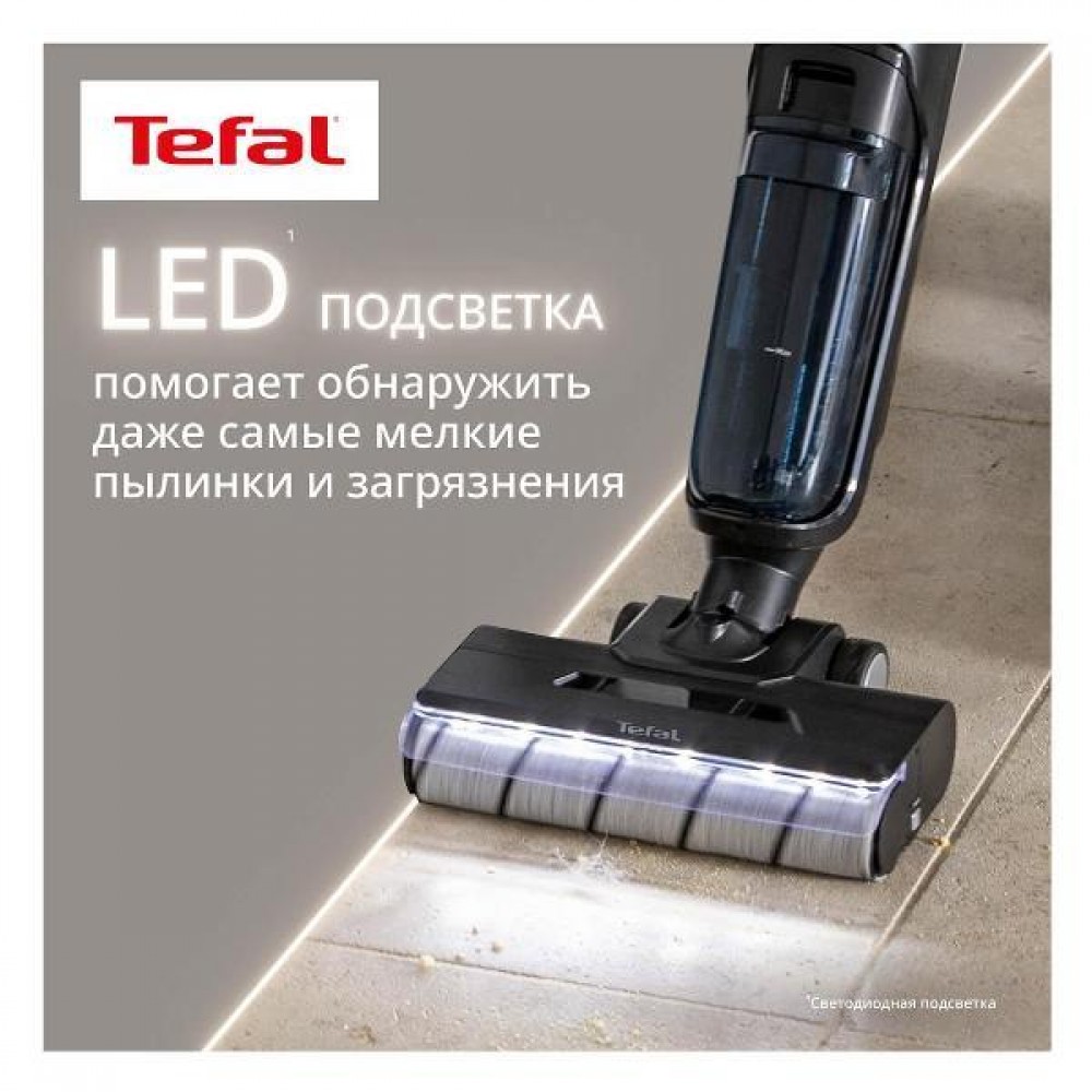 Моющий пылесос Tefal X-Clean 5GF5555F0 — лёгкость движения, чистота без компромиссов Tefal X-Clean 5 GF5555F0 создан для тех, кто хочет получать идеальный результат без усилий — он будто скользит по полу, оставляя после себя чистоту, свежесть и ощущение новизны пространства. Легкий, почти невесомый в руке (всего 1,1 кг во время использования), он становится естественным продолжением движения, позволяя вам убирать так, как удобно именно вам. Его продуманная конструкция скрывает мощную работу внутри: роликовая щётка вращается со скоростью 450 об/мин, не просто протирая поверхность, а действительно отмывая пол, снимая с него грязь, налёт и любые следы повседневной жизни. LED-подсветка мягким светом подсвечивает траекторию уборки, делая видимыми даже те крошки и пылинки, которые глаз обычно не замечает. Впечатляет и автономность — до 50 минут работы, достаточных для уборки площади до 300 м². Пылесос сам определяет степень загрязнения и подстраивает мощность, избавляя вас от лишних переключений. Система водяных резервуаров продумана до мелочей: — 730 мл для чистой воды — можно добавлять моющее средство для пола, — 440 мл для грязной воды, куда моментально уходит весь собранный мусор. И пока вы убираете, X-Clean 5 сам заботится о себе: щётка регулируемо промывается чистой водой и тут же всасывает использованную жидкость в контейнер, поддерживая постоянную эффективность. После уборки станция превращается в мини-сервисный центр — самоочистка и сушка щётки горячим воздухом 60°С возвращают ей свежесть и готовность к следующему запуску. Этот пылесос не просто убирает — он работает за вас. Он моет, освежает, собирает жидкость и сухой мусор одновременно, превращая уборку в чистое и простое действие.