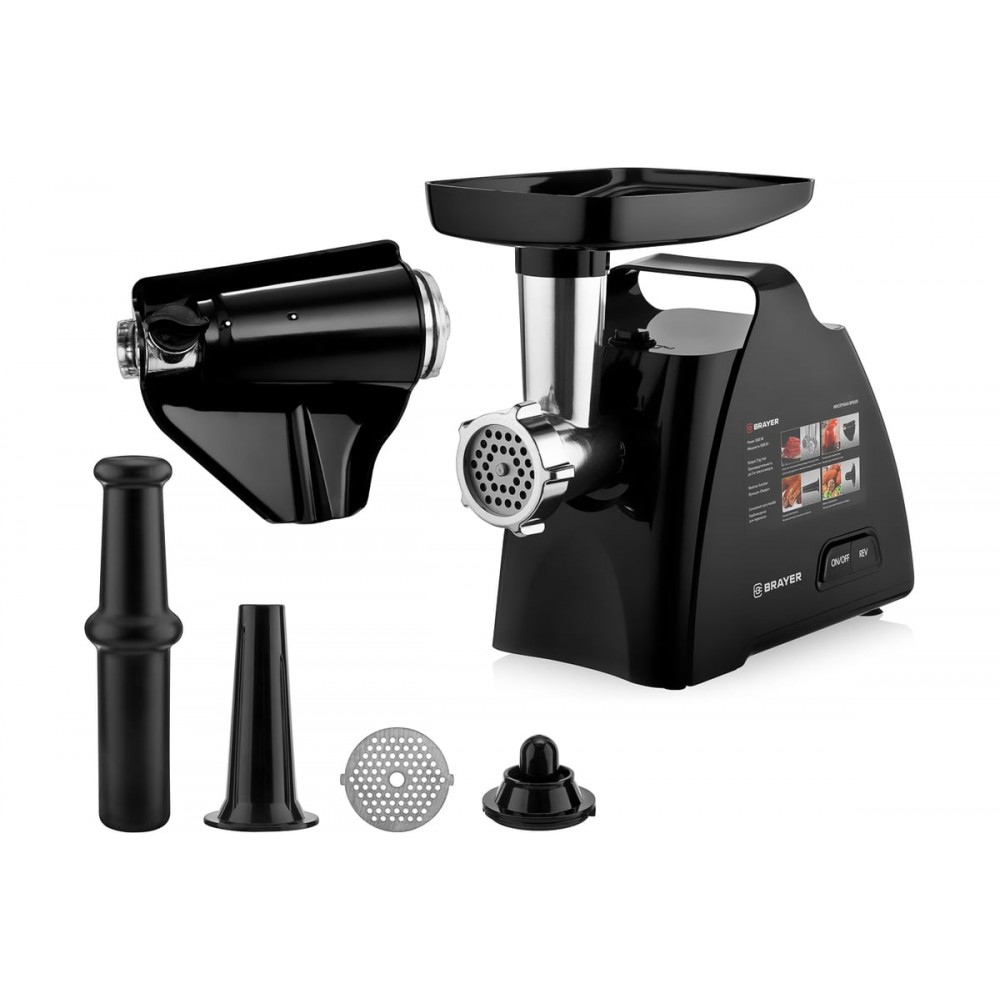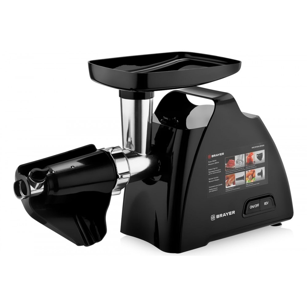 Мясорубка BRAYER 1606BR оснащена мощным мотором 1800 Вт, что обеспечивает производительность 2 кг фарша в минуту. В комплектации дополнительно предусмотрена насадка-соковыжималка. Мясорубка имеет функцию реверса. Если мясные волокна заблокируют шнек, с помощью обратного хода вы сможете извлечь их, не разбирая рабочую камеру.