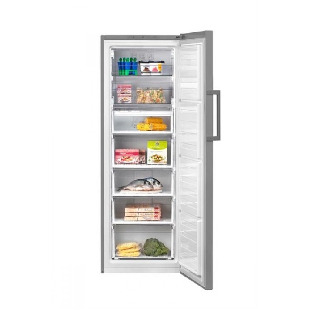 Beko RFSK266T01G предупреждает размораживание продуктов на протяжении 22 ч при отсутствии электричества. Открыть дверь на 90° и полностью выдвинуть ящики модно благодаря нулевому зазору. Внешнее покрытие из серого металла и пластика отличает устойчивость к появлению ржавчины и царапин, а также легкое удаление пятен. Сенсорная панель позволяет регулировать температуру замораживания от -18 до -24 °C. Для хранения продуктов предусмотрено 4 выдвижных ящика, 3 ящика с дверцей и поддон для ягод. При повышении температуры и неплотно закрытой двери загорается световой индикатор. Перемещение прибора осуществляется с помощью ножек-колес. Повысить мощность компрессора для быстрого замораживания мяса, птицы, рыбы позволяет режим «Суперзаморозка».