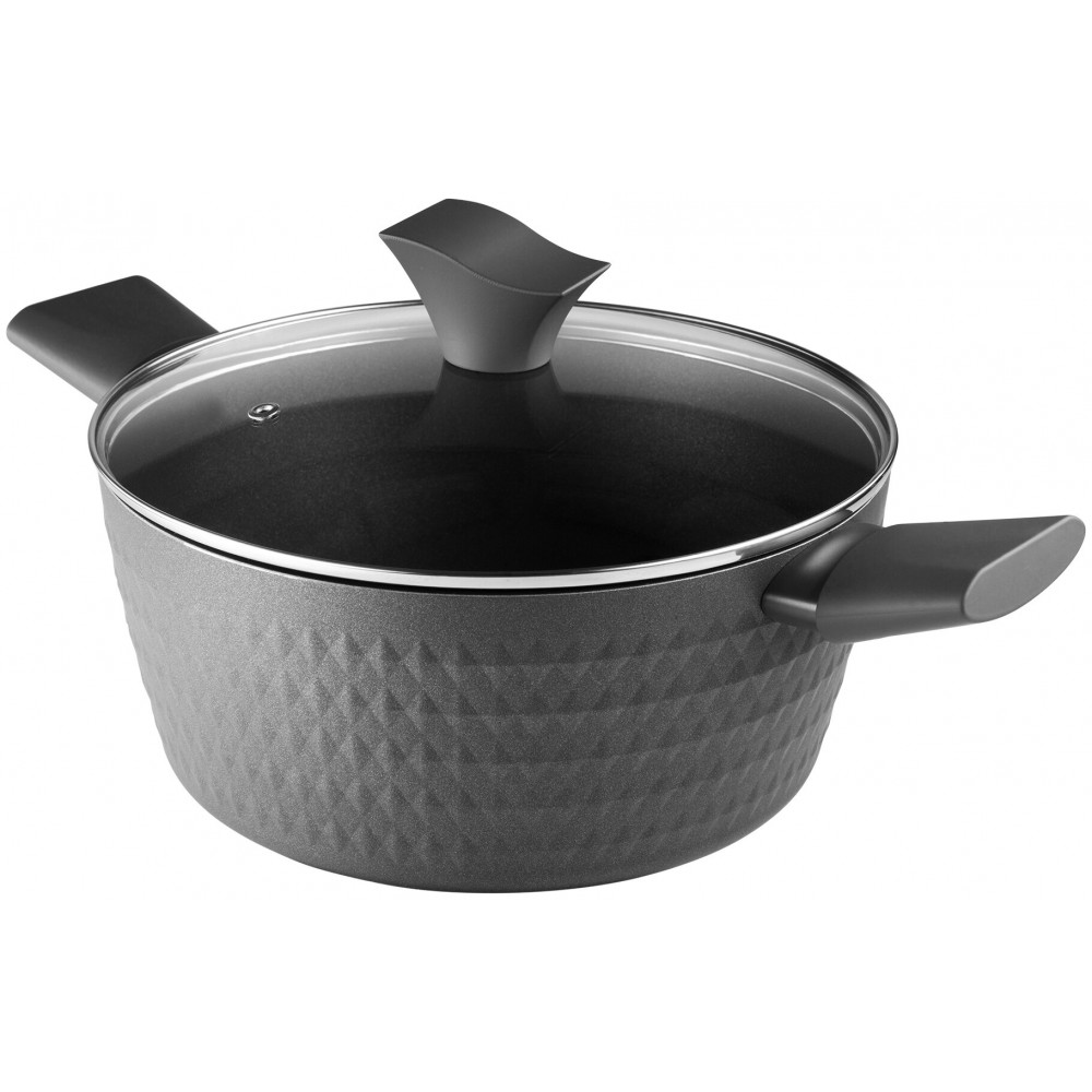 3D COOK Technology - для приготовления с низким содержанием жира. Материал - кованый алюминий. Внутреннее покрытие - двухслойное высокопрочное утолщенное антипригарное покрытие Pfluon. Термостойкое внешнее покрытие. Ручки - эргономичные бакелитовые ручки с покрытием "Soft Touch". Крышка из жаропрочного стекла с отверстием для выпуска пара. Подходит для всех типов плит, включая индукцию.